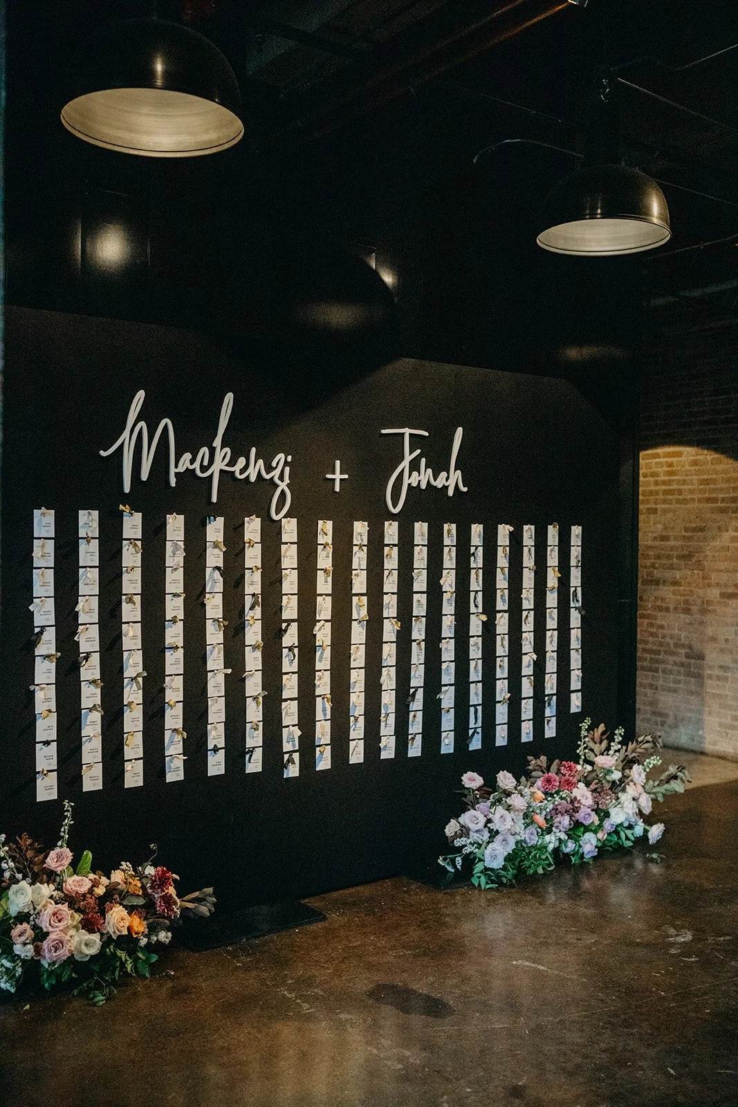 The best part of hosting a wedding in a venue that doesn’t have many bells and whistles upon first glance is being able to bring your unique vision to life without being confined by a patterned carpet or lighting fixtures that say “opulent” when your style is more “urban elegance”. Mackenzi and Jonah wanted to take their guests on a journey from warm and whimsical to sleek and sexy. We paired the light and airy ceremony flowers with black linens, taper candles, and menus for the reception to transport guests from one look to the other while keeping the aesthetic cohesive throughout the entire wedding.